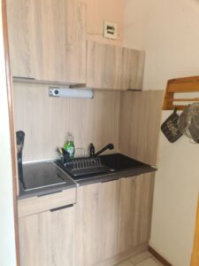 Une kitchenette toute équipée. Plaque de cuisson, four micro-onde, four, réfrigérateur/congélateur.