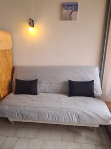 Une pièce à vivre lumineuse, disposant d’un canapé lit 140×190, une télévision écran plat.
